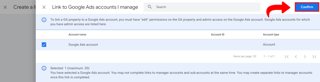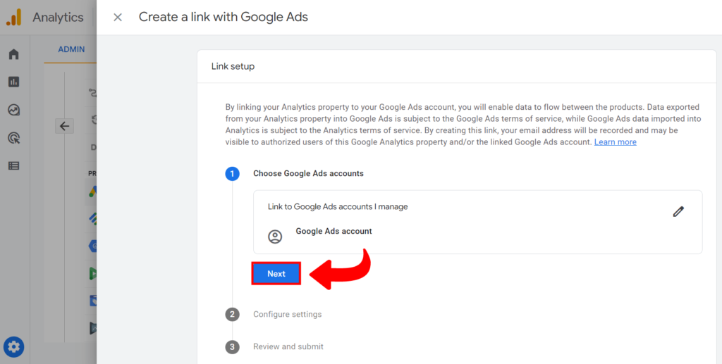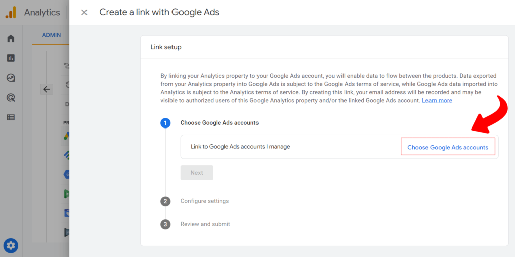 4. Izaberete Google Ads nalog sa kojim želite da povežete svoj GA4 nalog