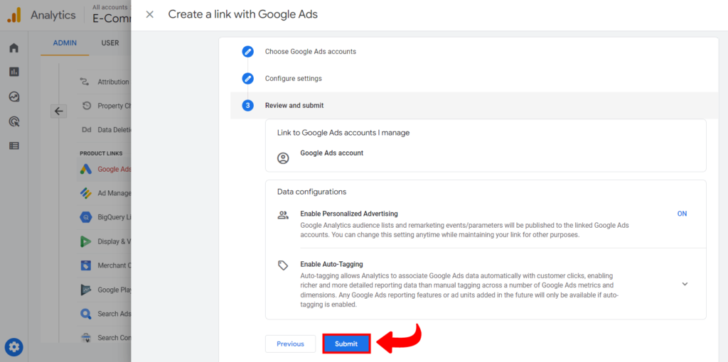 Videćete da je opcija “Enable Personalized Advertising” uključena, što predlažemo da ostavite, a ista predstavlja opciju da će vam sve “Audience liste” koje kreirate u vašem GA4 nalogu, automatski biti dostupne u Vašem Google Ads nalogu, što je veoma korisna opcija.