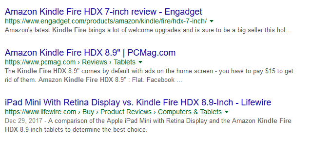 Recimo da vršimo pretragu za novi tablet koji želimo da kupimo, recept za omiljenuo jelo ili muziku. Google nam izlistava rezultate pretrage sa (regularnim) “snippet”-ima i “rich snippet”-ima zajedno odnosno izmešano.