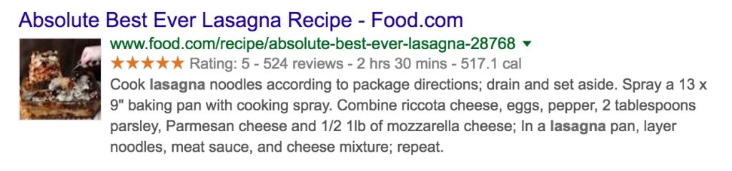 Sa strukturiranim podacima možete da “komunicirate” sa sajtovima za pretragu. Možete da mu sugerišete koje sastojke jela želite da prikaže u “rich snippets” u okviru vašeg recepta, zatim koliko je vremena potrebno da se pripremi jelo sa recepta, kao i koliko kalorija jelo sadrži. Google će odmah moći da preuzme date podatke, pa kasnije će da odluči da lI će I kada iste koristiti.